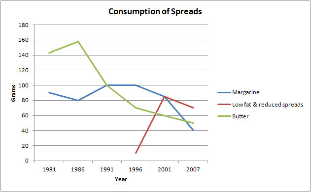 The line graph below shows the consumption of three types of spreads (margarine, low fat spreads and butter) from 1981 to 2007. Summarise the information by selecting and reporting the main features, and make comparisons where relevant. Write at least 150 words.